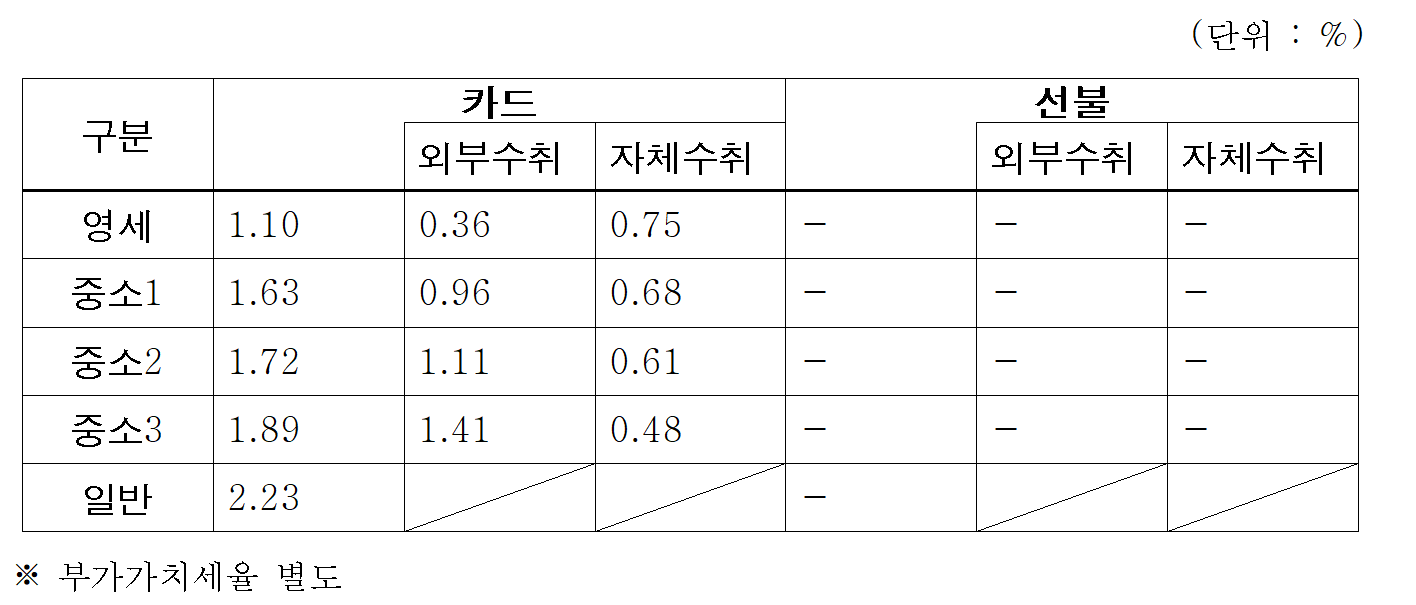 – ​위 수수료는 기간 내 가맹점 구간 별 전체 결제 건을 합산하여 산출하였으므로, 개별 가맹점에 적용된 수수료율과는 상이할 수 있습니다.